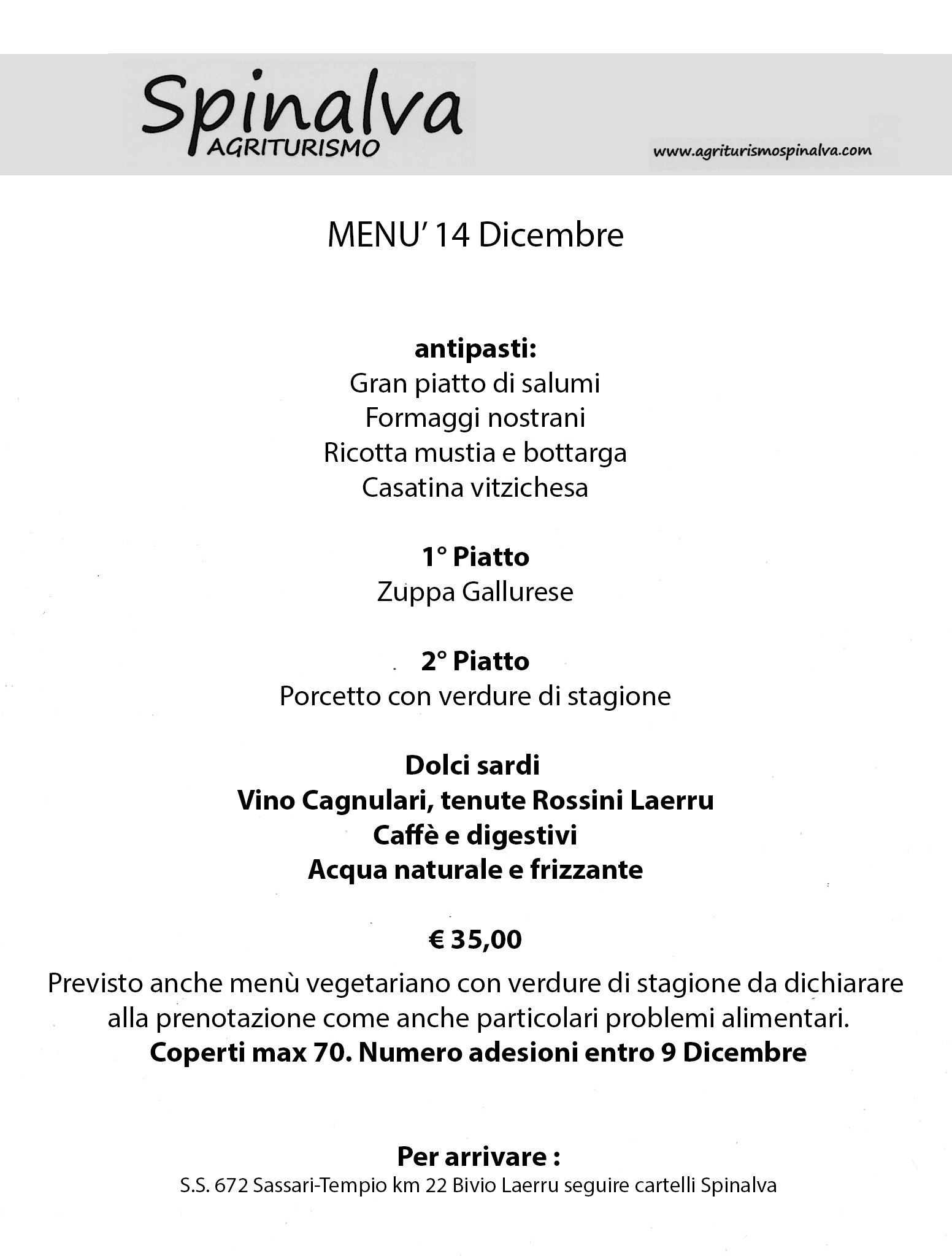 E’ necessario prenotare entro il 9 dicembre (max 70 coperti) telefonando a Speranza 3290430246 e chi riesce pagare anticipatamente in sede o sul luogo in contanti giusti. Speriamo di vedervi numerosi!! Vi informerò su ora e luogo di ritrovo per un giretto da fare nei paraggi alla mattina per chi volesse……
